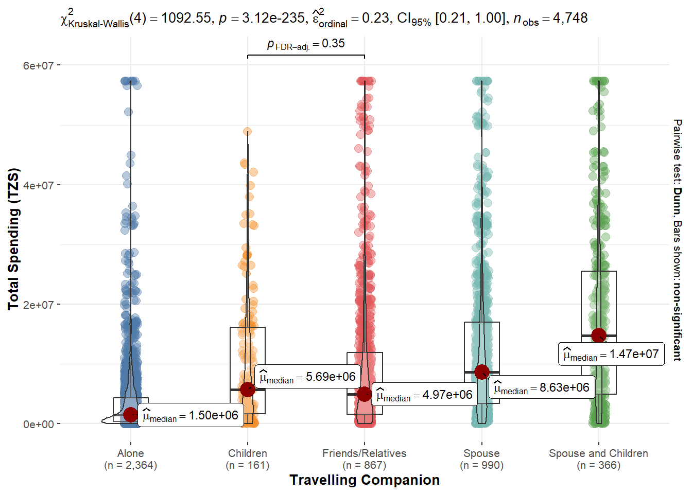 }plot_ANOVA(xaxis = "travel_with", yaxis = "total_cost", regionlist = c("Asia", "Africa", "Europe", "Oceania", "Americas"), testtype = "np", pair = "ns",conf = 0.95, nooutliers = T)