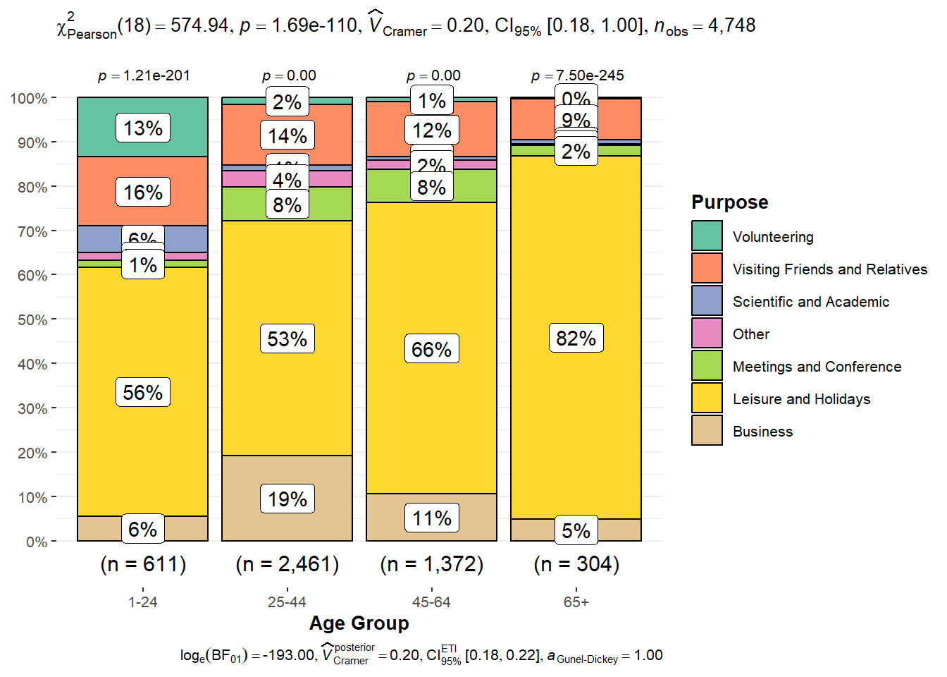 }plot_barstats(xaxis = "age_group", yaxis = "purpose", regionlist = c("Asia", "Africa", "Europe", "Oceania", "Americas"), testtype = "np",conf = 0.95)
