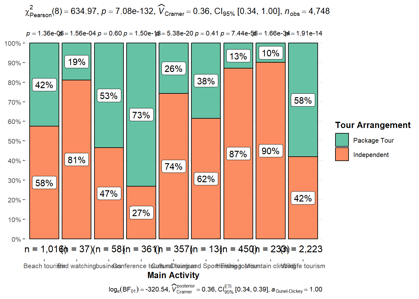 plot_barstats(xaxis = "main_activity", yaxis = "tour_arrangement", regionlist = c("Asia", "Africa", "Europe", "Oceania", "Americas"), testtype = "np",conf = 0.95)